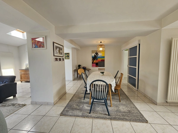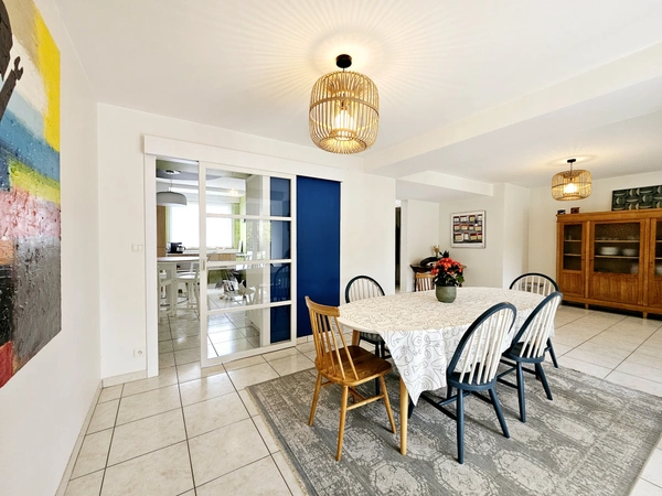 En EXCLUSIVITE, dans le quartier prisé du SACRE COEUR, venez découvrir cette surprenante maison de plus de 200m2. La luminosité, les volumes, la distribution rationnelle, le très grand garage et le superbe jardin sont les principaux atouts de ce bien qui héberge au Rez de Chaussée, une belle entrée dotée de pavés de verre, une cuisine haut de gamme toute récente, un double séjour avec poêle à bois, une buanderie et un WC. L'étage, quant à lui est partagé par cinq chambres, un grand bureau/salonTV et deux pièces d'eau avec WC. Le vaste garage de 40m2 peut accueillir plusieurs véhicules et deux roues. Bien RARE sur le secteur proposé par Votre conseillère Anne-Marie BREMAUD 06 58 54 41 03 abremaud@noovimo.fr.